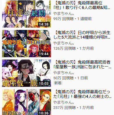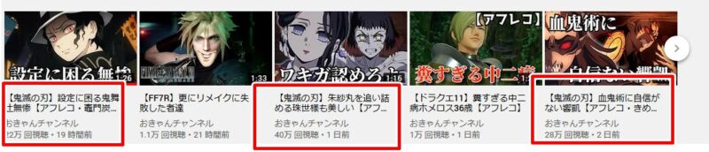 鬼滅の刃系の動画であれば、ほとんどの動画が再生回数が桁違いに高いのです。