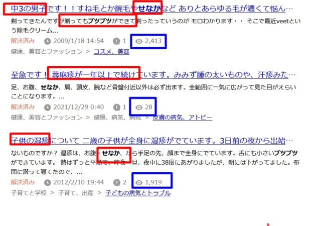 たとえば「せなか ぶつぶつ」で知恵袋検索をしたときに