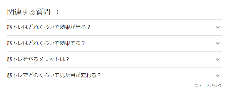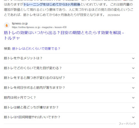 キーワード「筋トレ」を入れて検索すると、検索結果1ページ目の真ん中にこのような質問がでてきます。